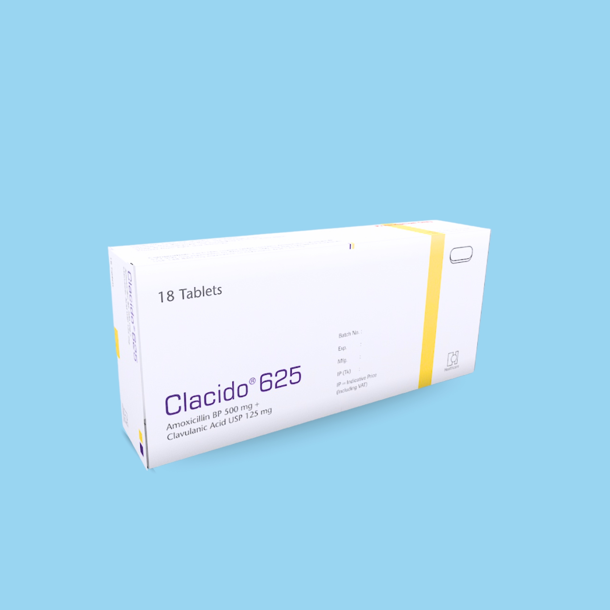 Clacido® Tablet 625 mg: Each box contains 3 x 6’s film coated tablets in Alu-Alu blister pack.