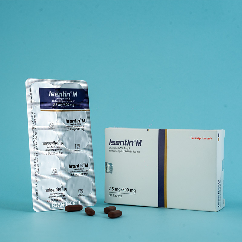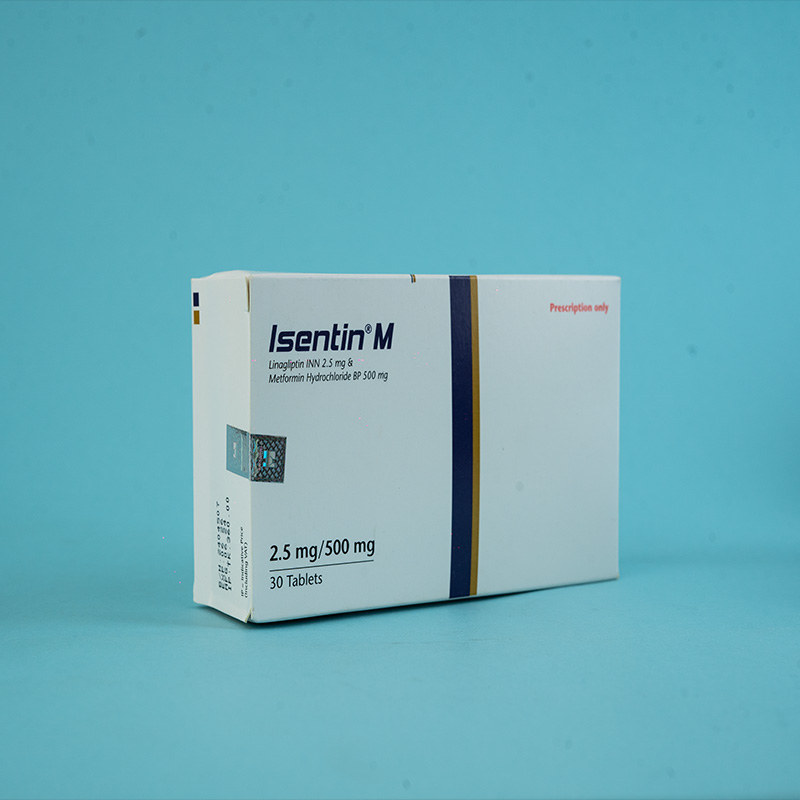 Isentin-M® combines two antihyperglycemic agents with complementary mechanisms of action to improve glycemic control in patients with type 2 diabetes: Linagliptin, a dipeptidyl peptidase-4 (DPP-4) inhibitor, and Metformin hydrochloride, a member of the biguanide class. Linagliptin is a dipeptidyl peptidase-4 (DPP-4) inhibitor, which is believed to exert its actions in patients with type 2 diabetes by slowing the inactivation of incretin hormones. Incretin hormones, including glucagon-like peptide-1 (GLP-1) and glucose-dependent insulinotropic polypeptide (GIP), are released by the intestine throughout the day and levels are increased in response to a meal. These hormones are rapidly inactivated by the enzyme, DPP-4. The incretins are part of an endogenous system involved in the physiologic regulation of glucose homeostasis. When blood glucose concentrations are normal or elevated, GLP-1 & GIP increase insulin synthesis & release from pancreatic beta cells by intracellular signaling pathways involving cyclic AMP. GLP-1 also lowers glucagon secretion from pancreatic alpha cells, leading to reduced hepatic glucose production. By increasing and prolonging active incretin levels, Linagliptin increases insulin release & decreases glucagon levels in the circulation in a glucose-dependent manner. The pharmacologic mechanism of action of Metformin is different from other classes of oral antihyperglycemic agents. Metformin decreases hepatic glucose production, decreases intestinal absorption of glucose & increases peripheral glucose uptake and utilization.