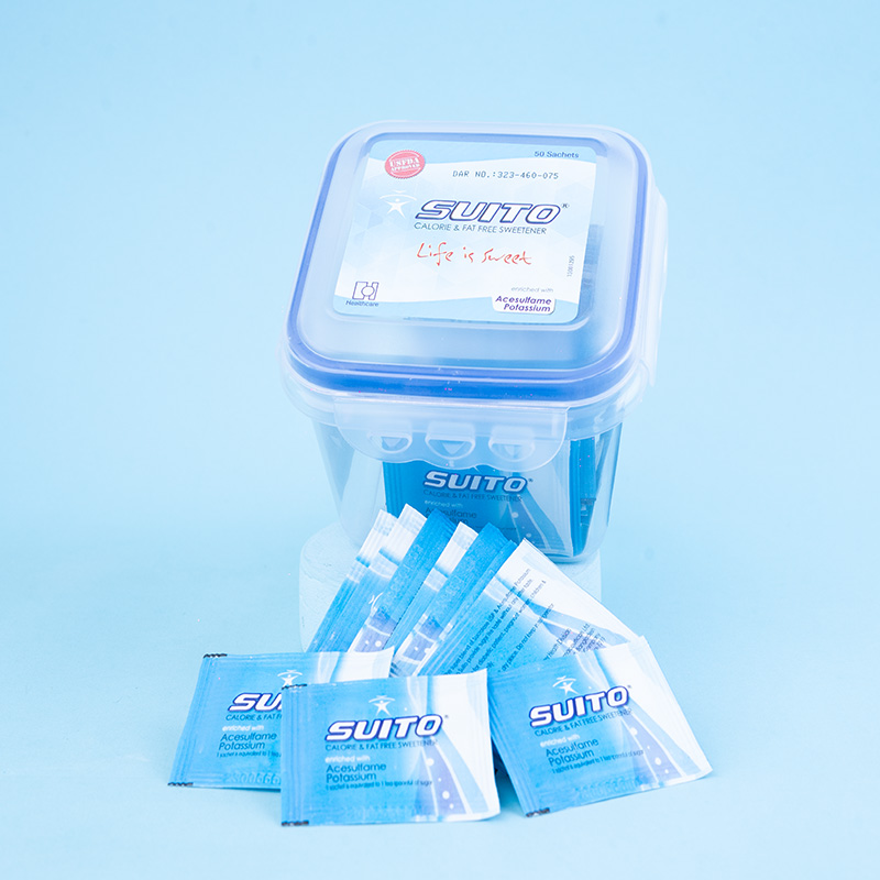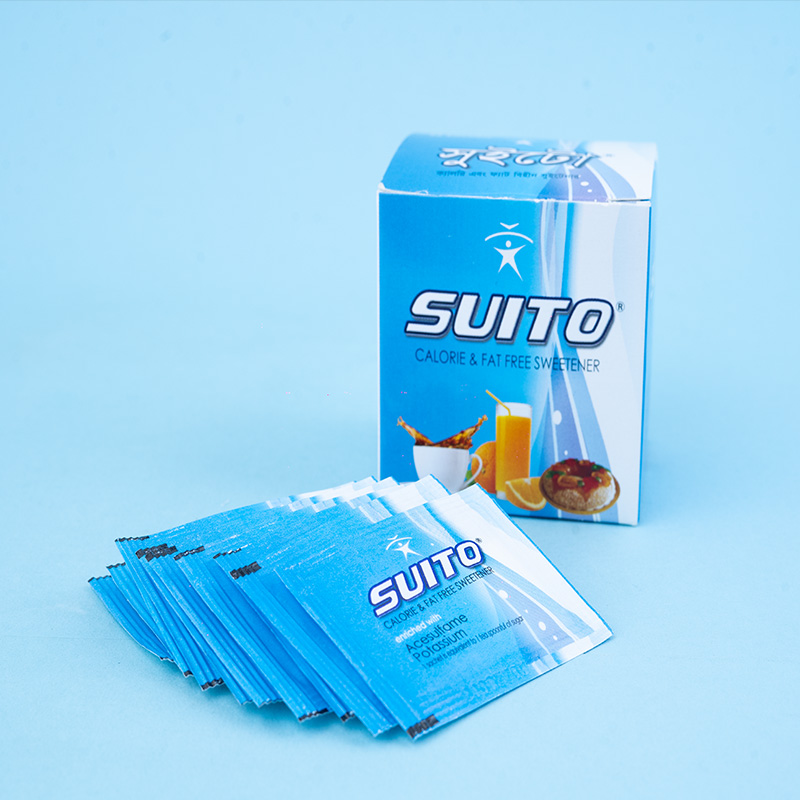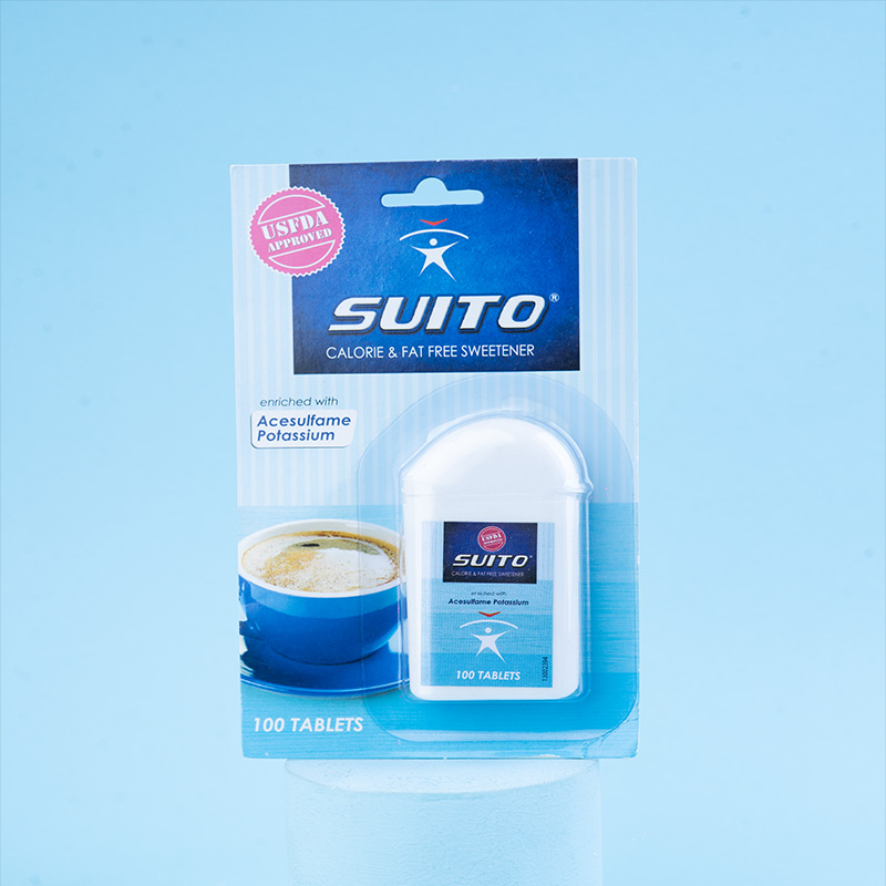 Suito is non-caloric sweetener. The majority of ingested Suito is not broken down by the body and therefore it is non-caloric. Sucralose & Acesulfame Potassium is 600 and 200 times as sweet as sucrose (table sugar) respectively. Sucralose is 3 times as sweet as Aspartame whereas Acesulfame Potassium is as sweet as Aspartame. Sucralose & Acesulfame Potassium are blended to give a more sugar-like taste whereby each sweetener masks the others aftertaste and exhibits a synergistic effect by which the blend is sweeter than its components. Suito is stable under heat and over a broad range of pH conditions.